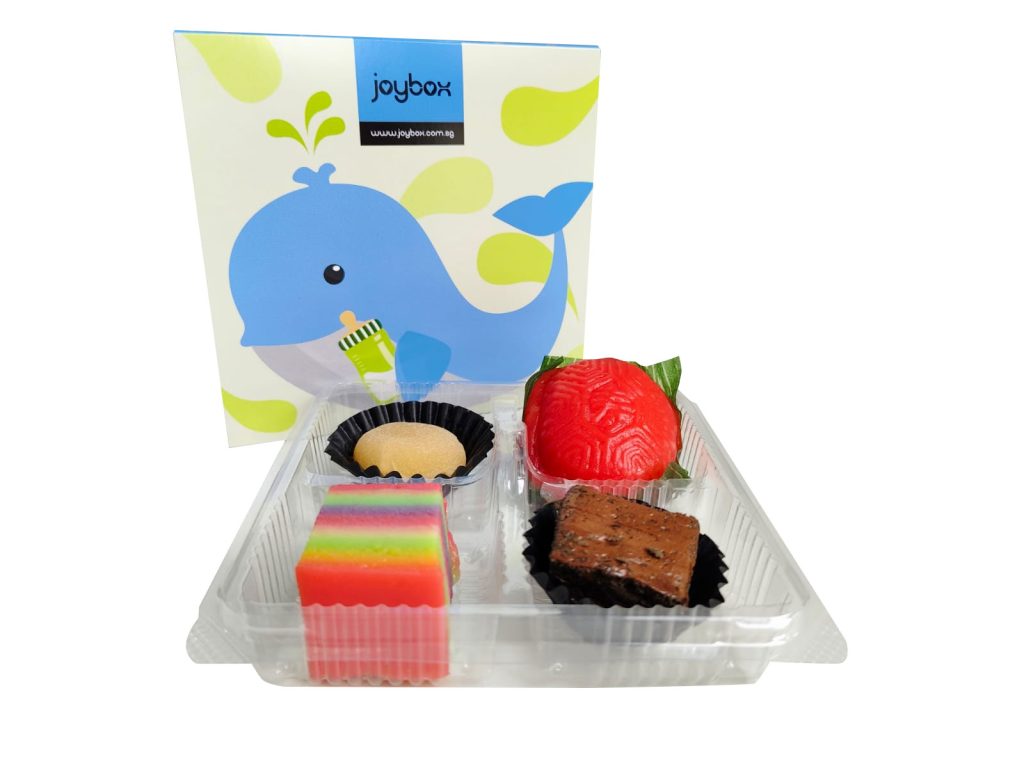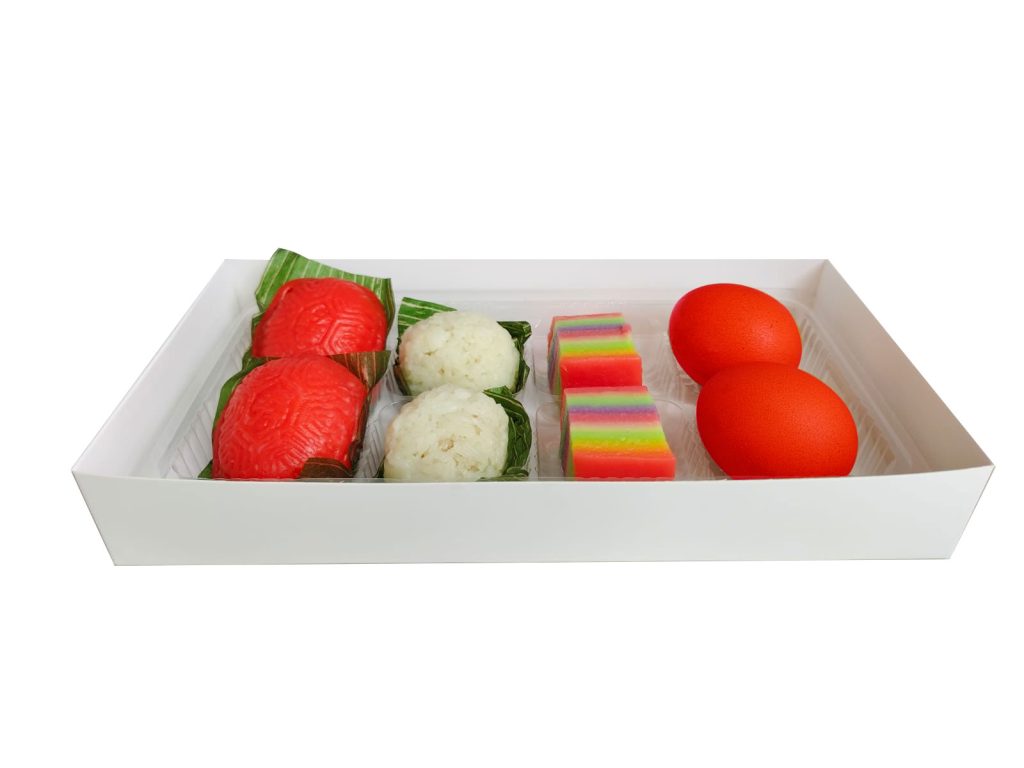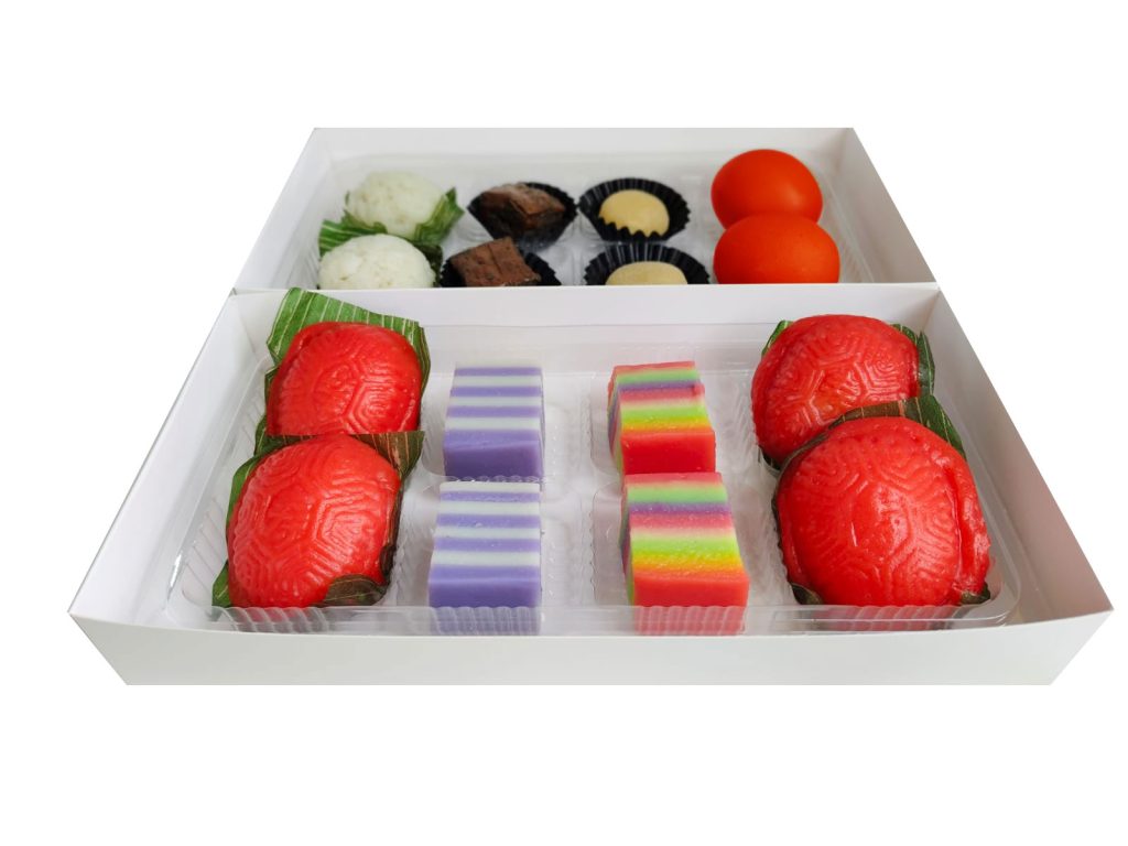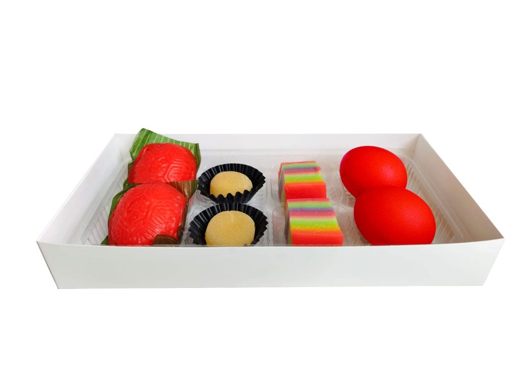 Indulge in our baby full month gift box for your guests, featuring red eggs, ang ku kueh (for girls) or ang yee (for boys), rice ball with heybi-hiam, kueh lapis, mochi and brownies . Our commitment to providing fresh food means that we prepare it on the date of delivery and guarantee* its freshness.