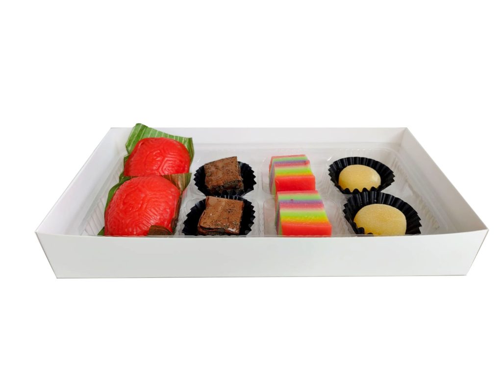 $18.50 >> 8 pieces (2 ang yee/ang ku kueh + 2 fruit mochis + 2 brownies + 2 kueh lapis)